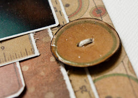De knopen uit het papier heb ik uitgeknipt, glanzend gemaakt (embossingpoeder) en op de achtergrond genaaid.